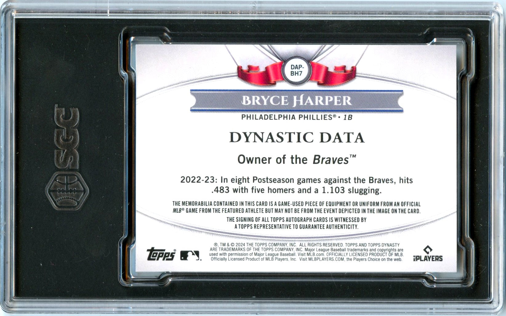 Bryce Harper 2024 Topps Dynasty Game Used Patch Auto SP 8/10 SGC 9