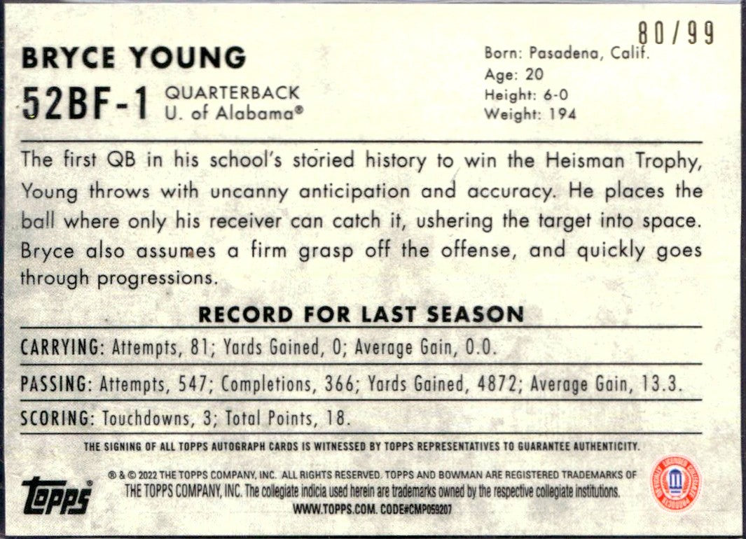 Bryce Young RC 2022 Bowman University Chrome 1955 Flashback Rookie Auto SP 80/99