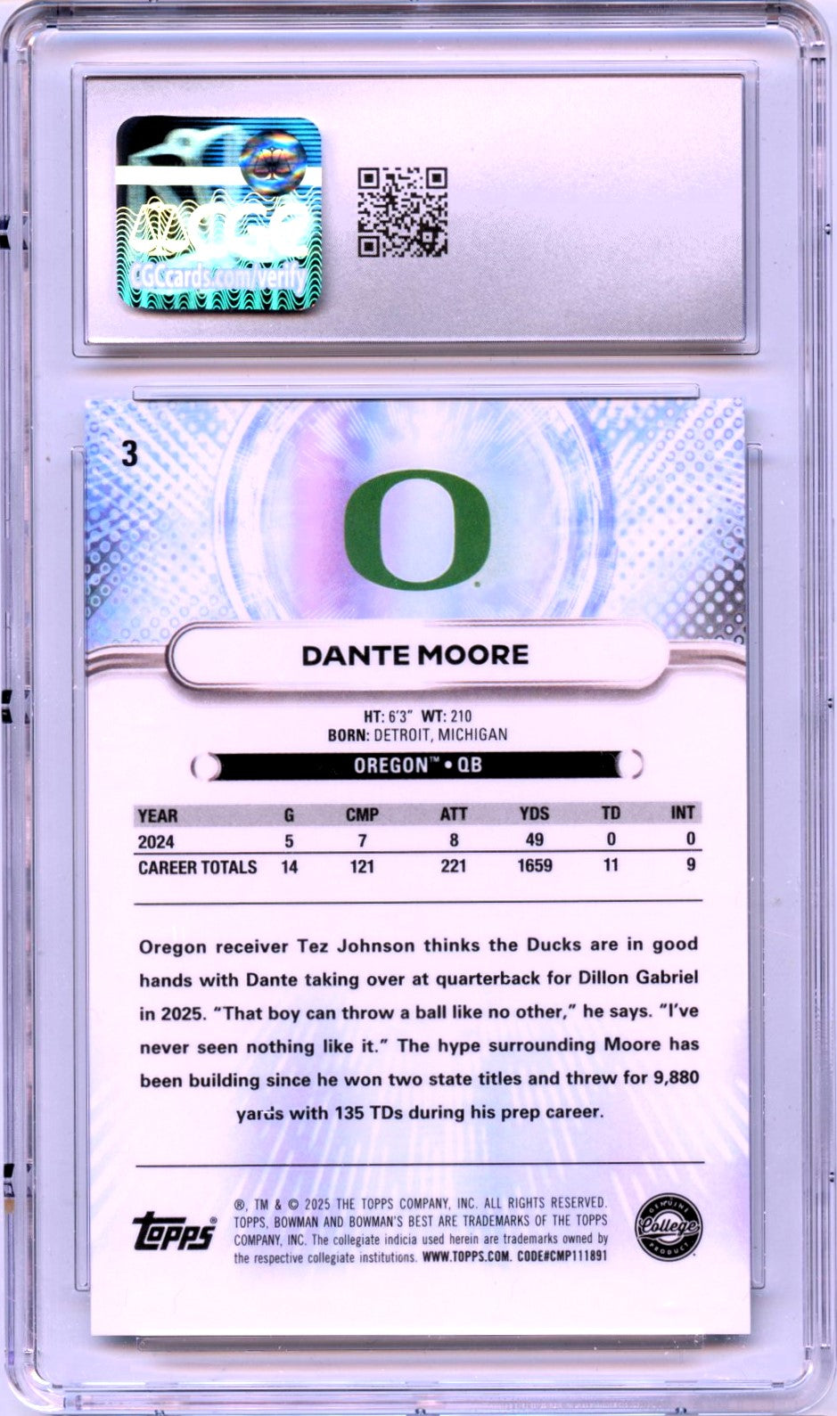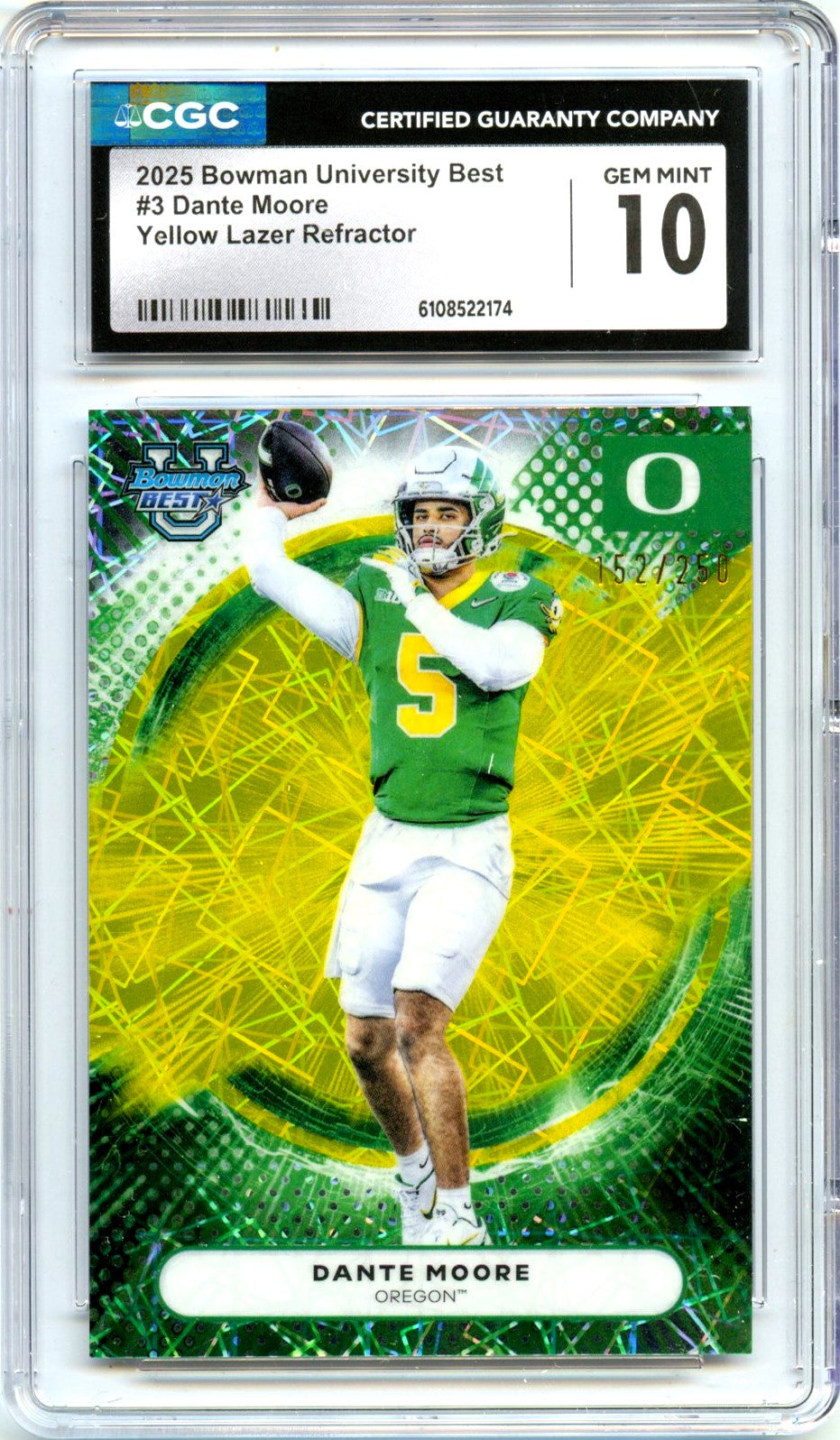 Dante Moore RC 2025 Bowman U Best Yellow Lazer Rookie SP 152/250 CGC 10