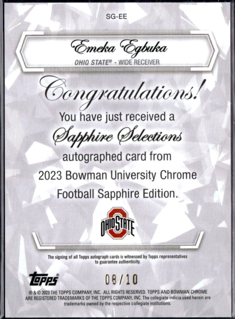 Emeka Egbuka RC 2023 Bowman U Chrome Sapphire Selections Black Rookie Auto SP 8/10