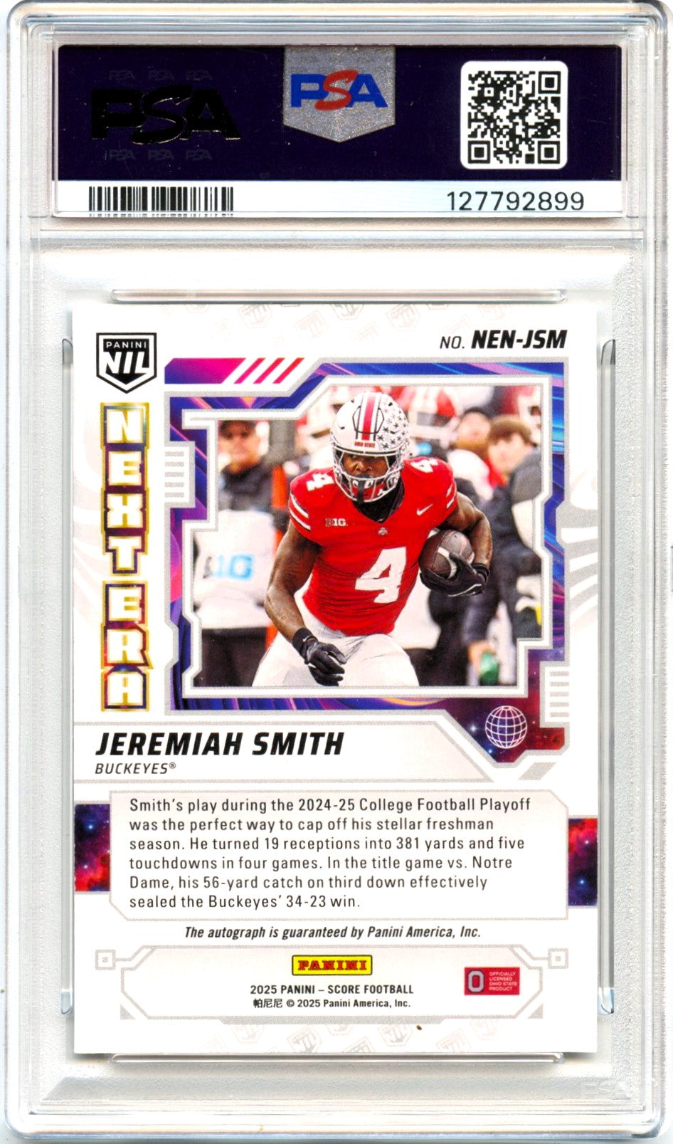 Jeremiah Smith 2025 Panini Score NIL Ground Zero Next Era Rookie Auto SP 17/25 PSA 9