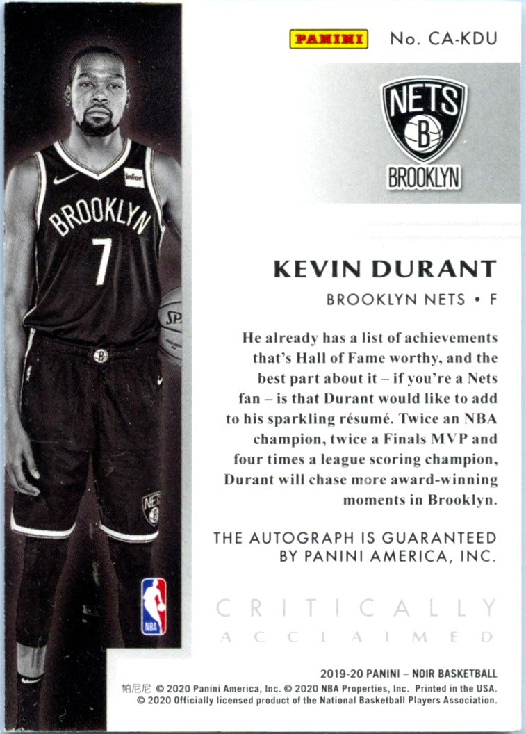 Kevin Durant 2019-20 Panini Noir Critically Acclaimed On Card Auto SP 47/49