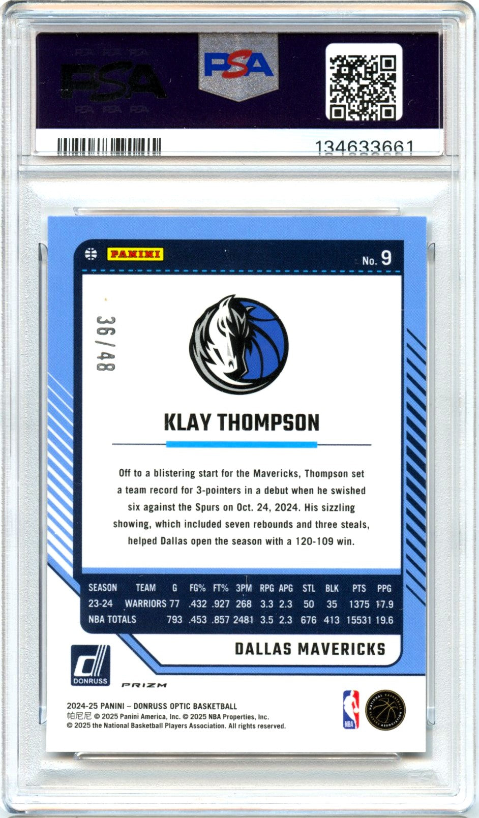 Klay Thompson 2024-25 Donruss Optic White Choice SP 36/48 PSA 10