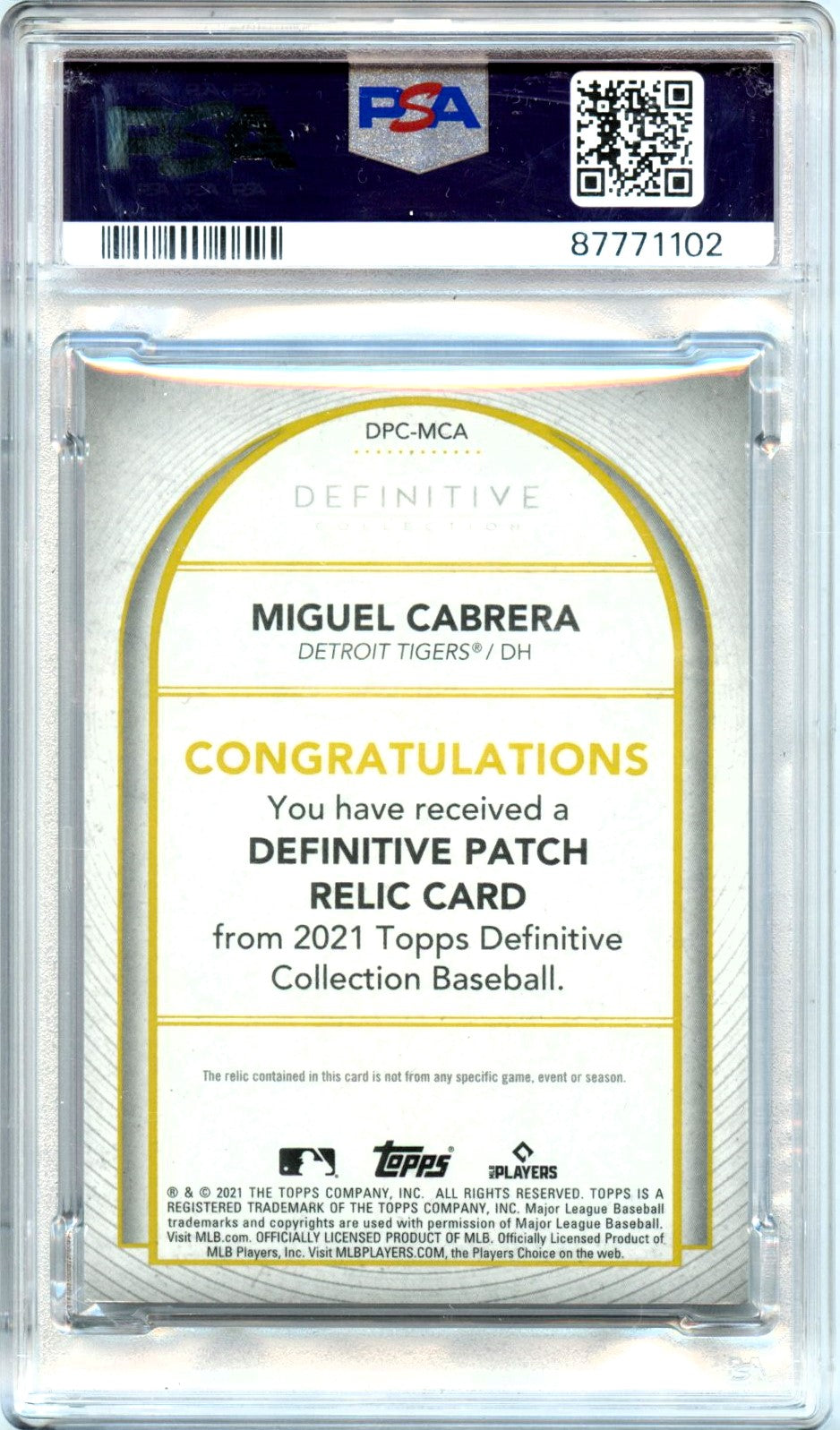 Miguel Cabrera 2021 Topps Definitive Game Used MLB Logo Patch SP 1/1 PSA 9
