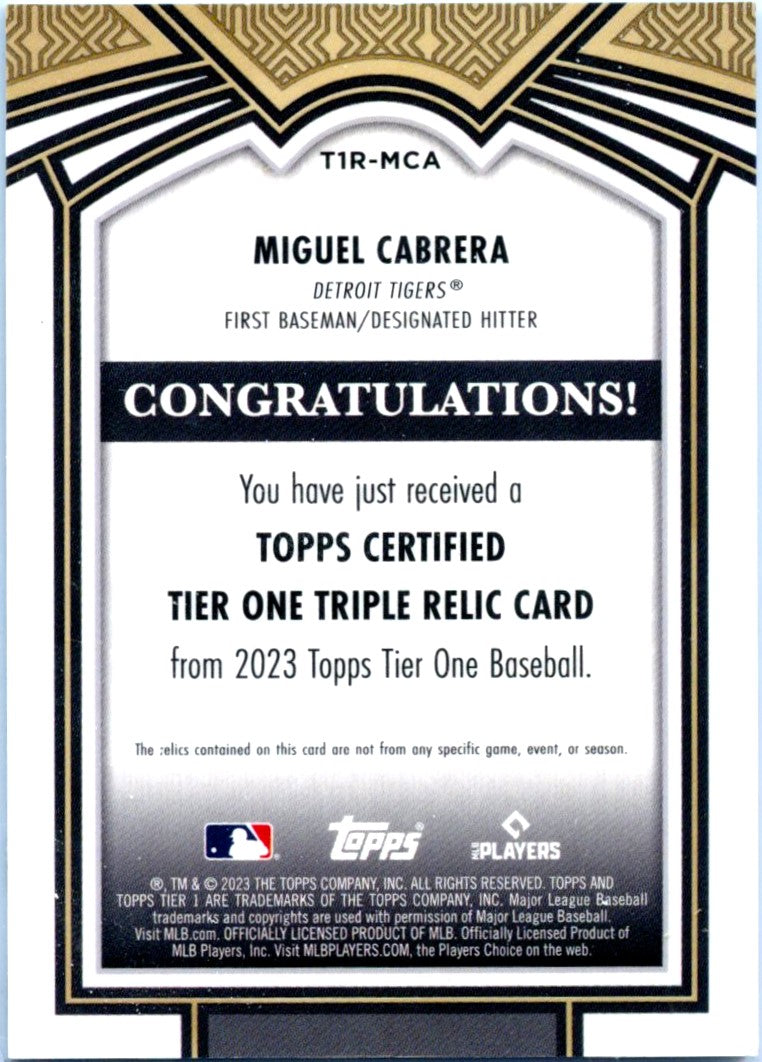 Miguel Cabrera 2023 Topps Tier One Triple Game Used Bat Piece Jersey Patch SP 1/1