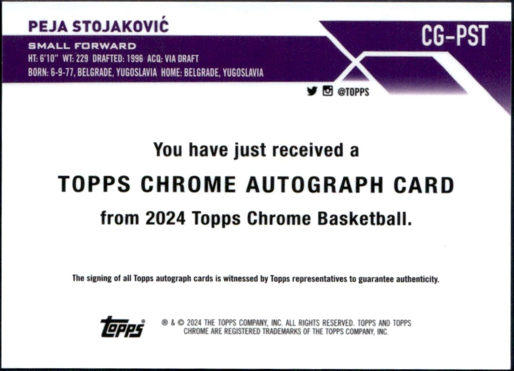 Peja Stojakovic 2024-25 Topps Chrome Sapphire Padparadscha Auto SP 1/1