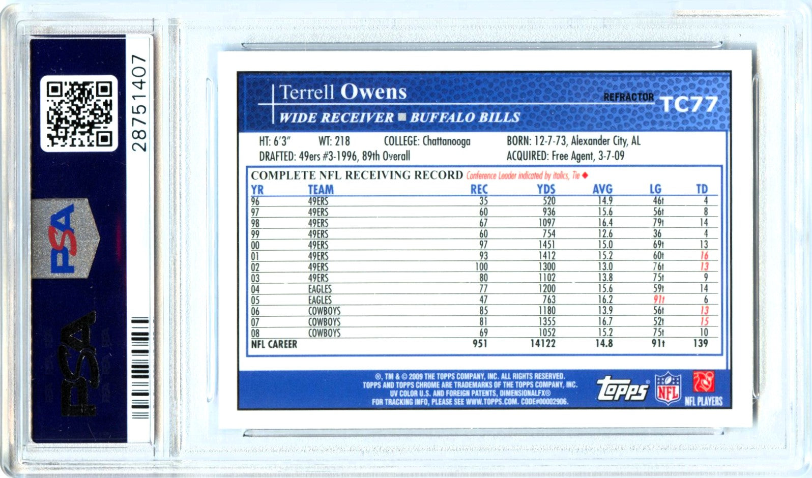 Terrell Owens 2009 Topps Chrome Blue Refractor PSA 10