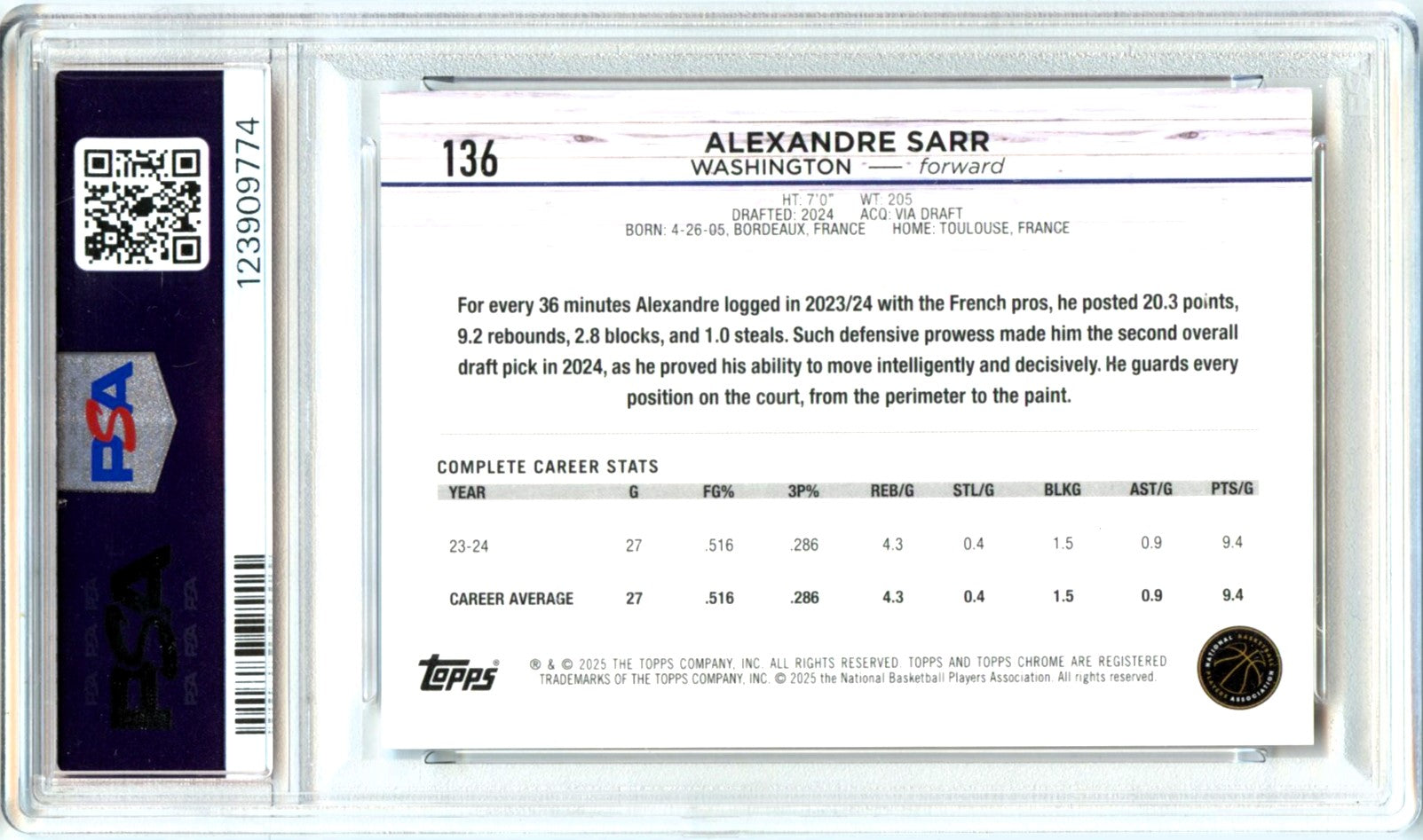 Alexandre Sarr RC 2024-25 Topps Chrome Sapphire Orange Rookie SP 19/25 PSA 10