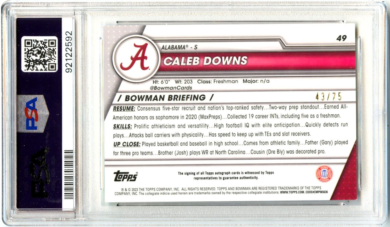 Caleb Downs RC 2023 Bowman University Chrome Yellow Rookie Auto SP 43/75 PSA 9