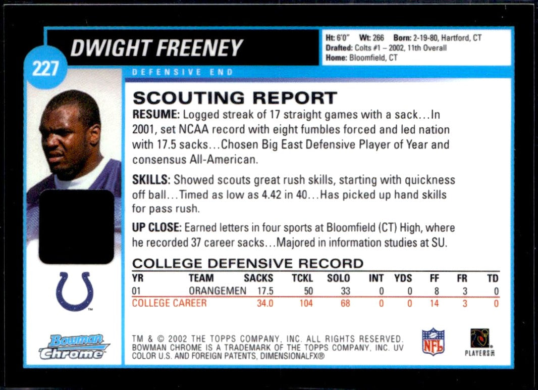 Dwight Freeney RC 2002 Bowman Chrome Rookie Auto #227