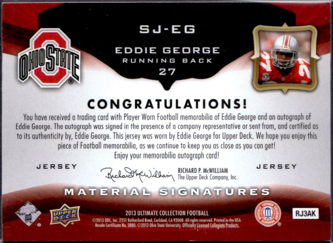 Eddie George 2013 UD Ultimate Collection Dual Patch Auto SP 6/30