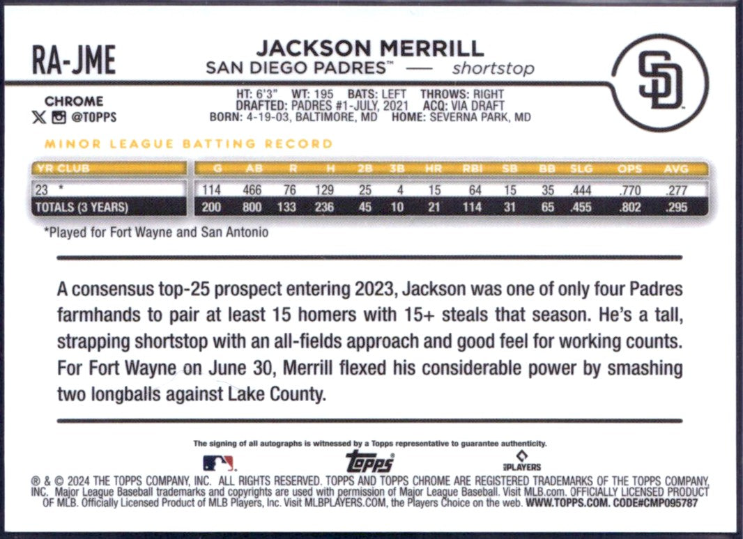 Jackson Merrill RC 2024 Topps Chrome Magenta Fuchsia Lava Lamp Rookie Auto SP 78/299
