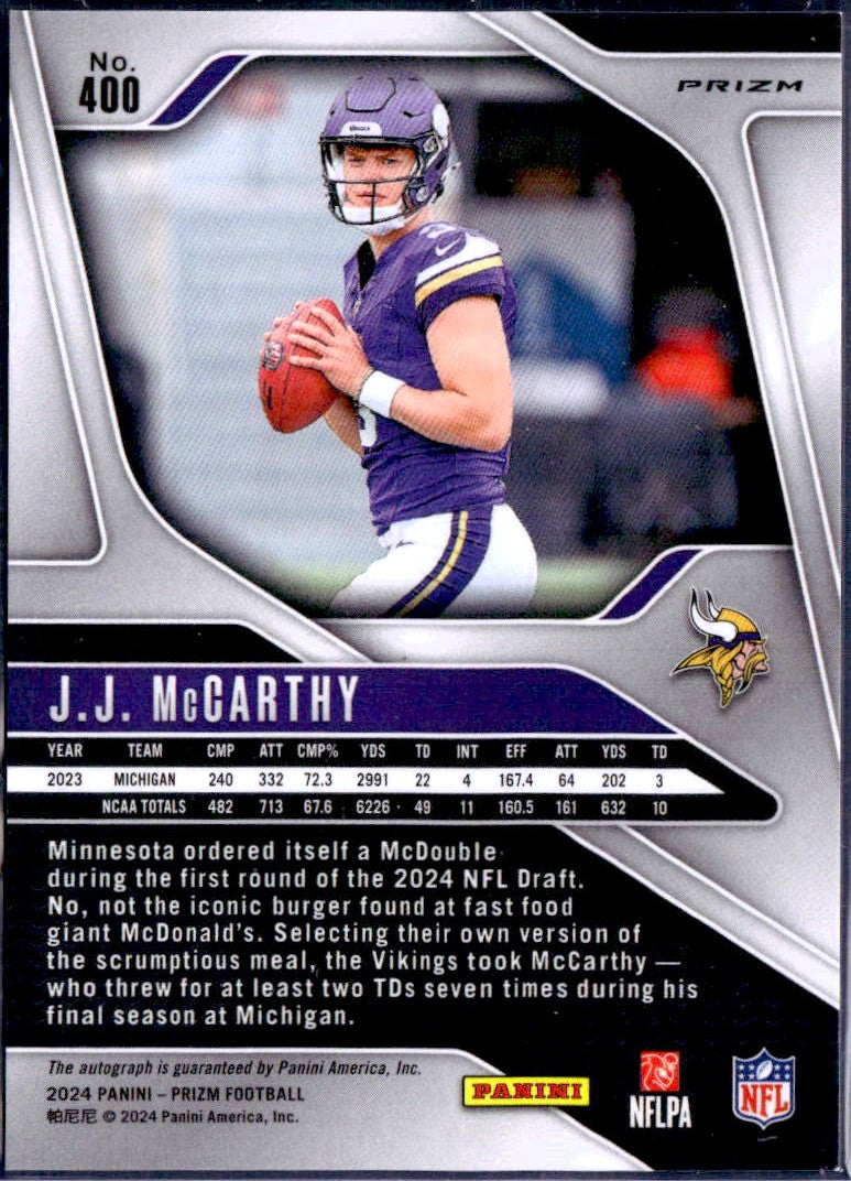JJ Mccarthy RC 2024 Panini Prizm Silver Rookie Auto #400
