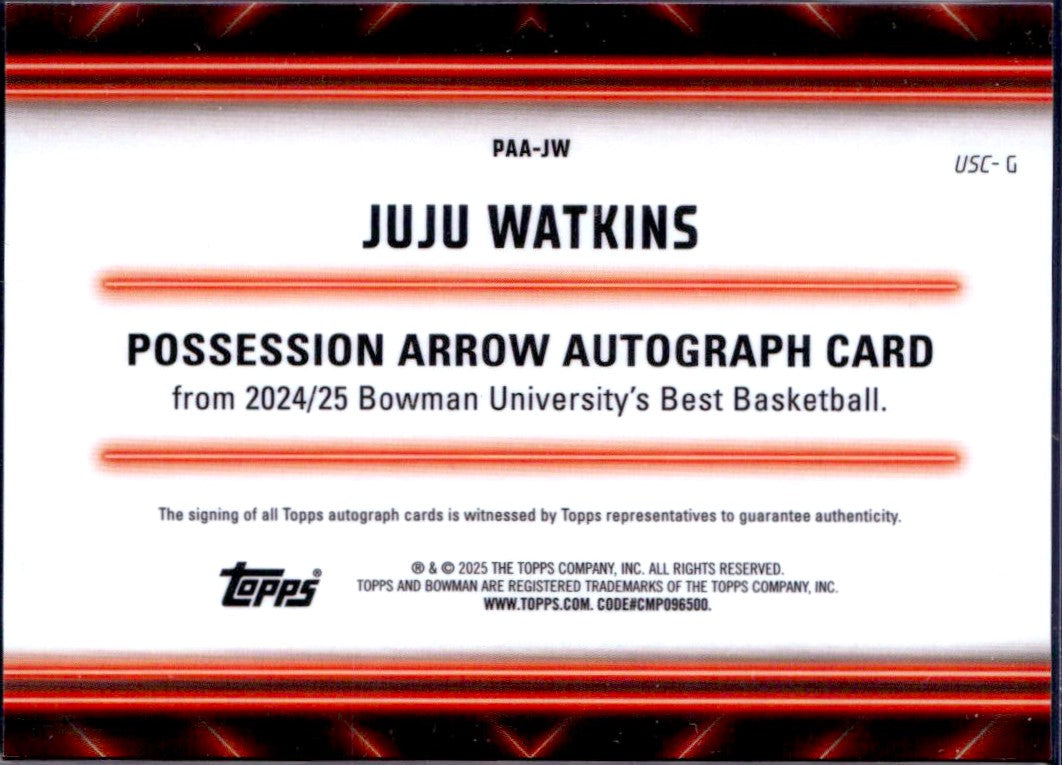 Juju Watkins RC 2024-25 Bowman U Best Orange Mini Diamond Possession Arrow Rookie Auto SP 2/25