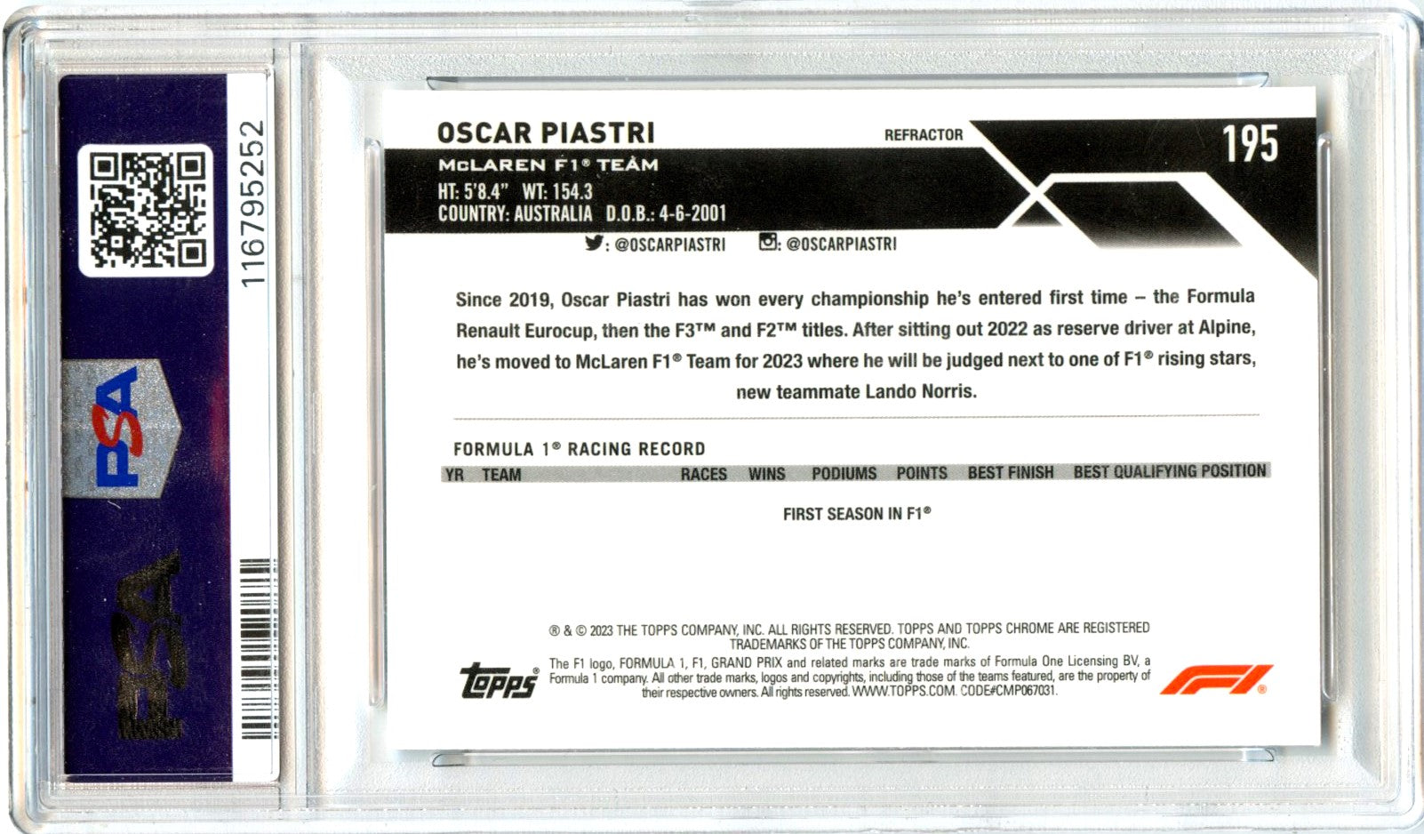 Oscar Piastri RC 2023 Topps Chrome F1 Refractor Rookie #195 PSA 10