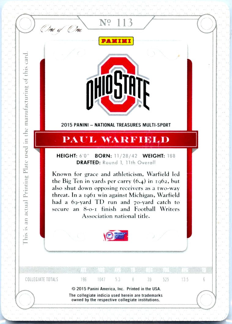 Paul Warfield 2015 National Treasures Collegiate Printing Plate SP 1/1